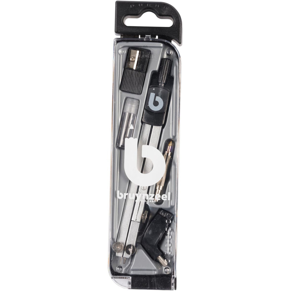 To use the Bruynzeel compass, simply open the case, select the desired part, and place it on a flat surface. Align the compass with the desired direction, and use the graduated scale to take precise measurements. The compact design allows for easy handling and storage in the provided case.