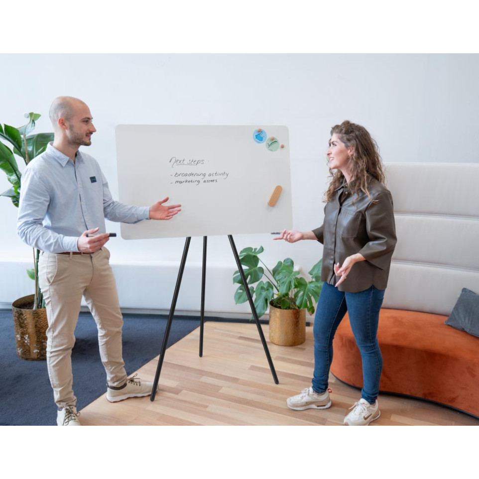 The Legamaster Sketch Infinite is a frameless, mobile flipchart and whiteboard with a stylish wood-accented back, magnetic enamel steel surface, and a sturdy adjustable tripod. Ideal for conference rooms and collaborative workspaces, it supports both brainstorming and presentation activities.