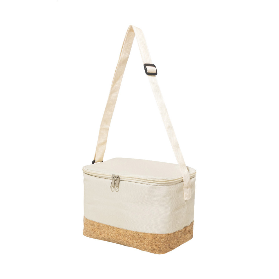 Sturdy and eco-conscious, the Kooper natural RPET cooler bag keeps food and drinks cool for any outing, featuring a zipped main compartment, cork-reinforced base, and comfortable adjustable shoulder strap for hands-free transport.