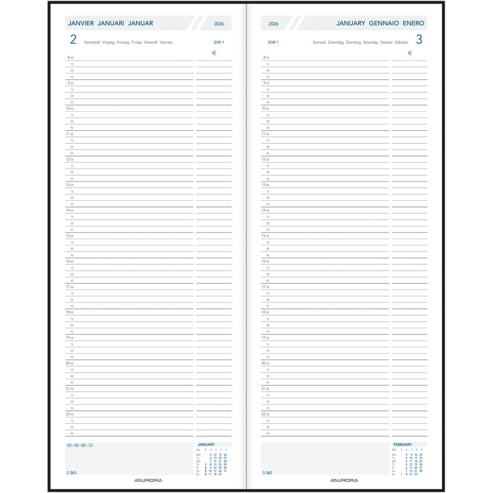 Open the agenda to access a full page for each day, allowing you to record appointments, deadlines, and amounts. The lined format and dedicated sections support organized note-taking, while perforated corners help you quickly locate the current date. Suitable for daily desk use in multi-lingual or international environments.