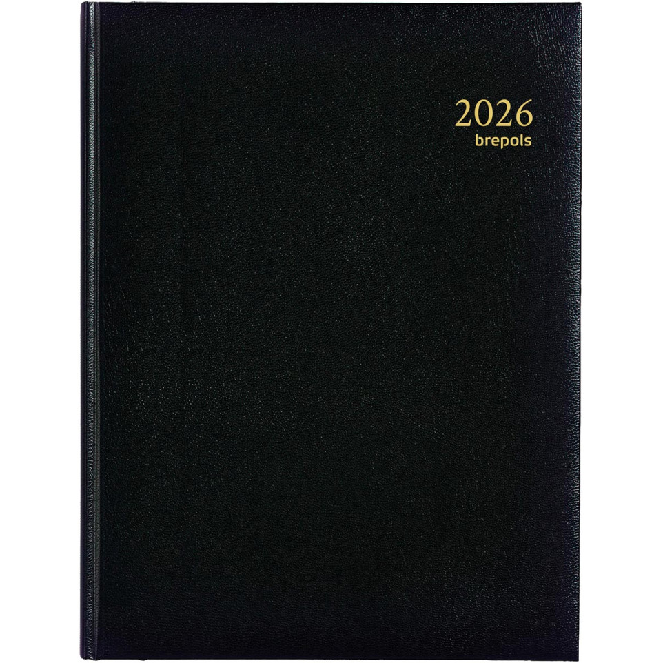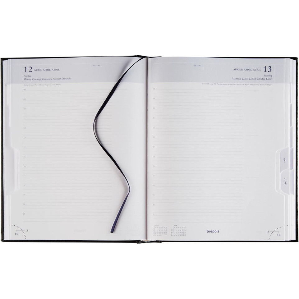 The Brepols Ambassador Lima, black, is a daily counter agenda designed for efficient scheduling, featuring a one-day-per-page layout with hourly slots from 8 a.m. to 9 p.m. It is ideal for professional or personal organization requiring precision and multilingual support.