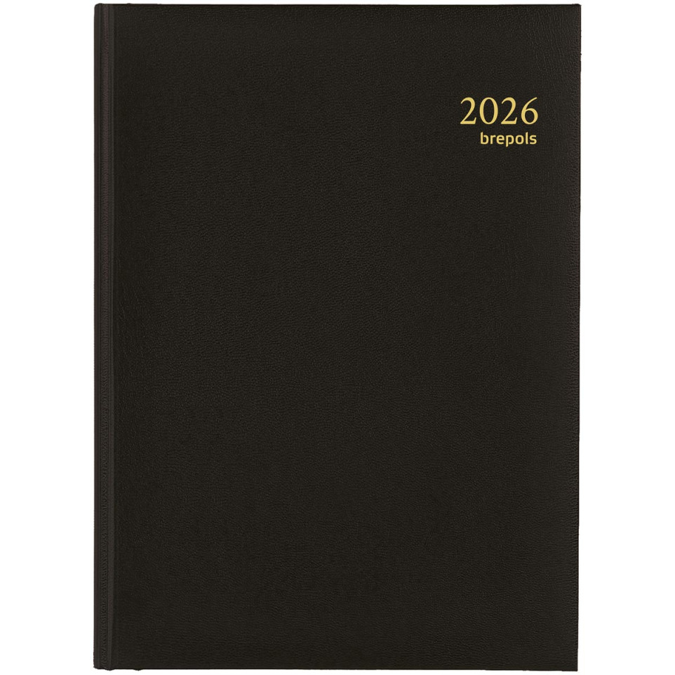 The Brepols Euro Lima 2026 Counter Agenda in black is a bound daily planner designed for professionals who need detailed time management. It features a one-day-per-page format with hourly scheduling, ideal for users requiring structured organization.