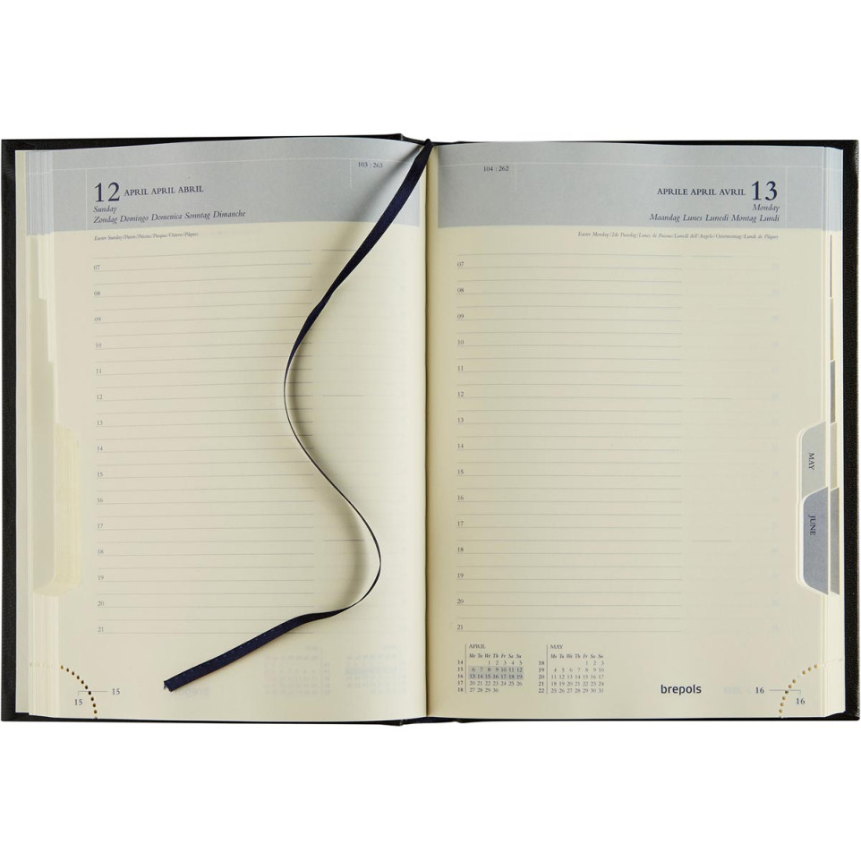 Open to any date to reveal a full daily schedule, clearly divided by hour. Use the ribbon bookmark or detachable corners for fast access. Write appointments, tasks, and notes directly onto the cream pages. The multilingual format supports use across diverse teams or locations.