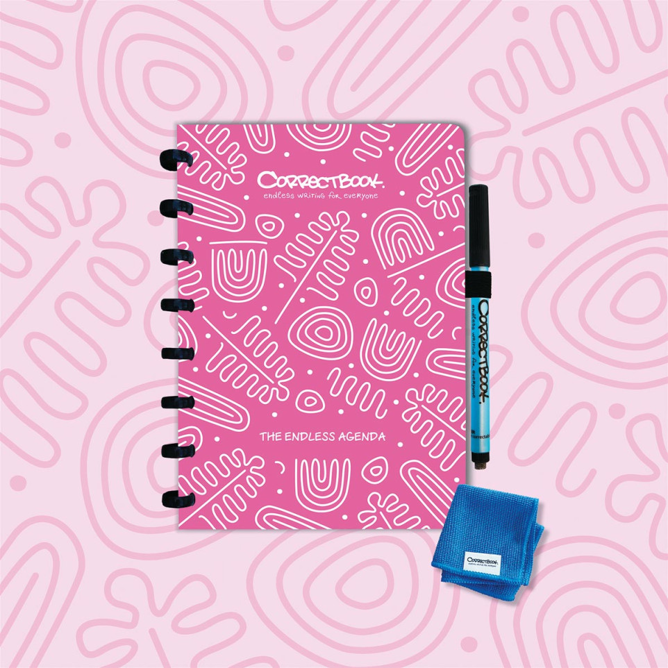 The Correctbook Endless Agenda A5 in Blossom Pink is designed for managing appointments, schedules, and lists in a reusable format. Ideal for personal or professional use where flexibility and sustainability are valued.