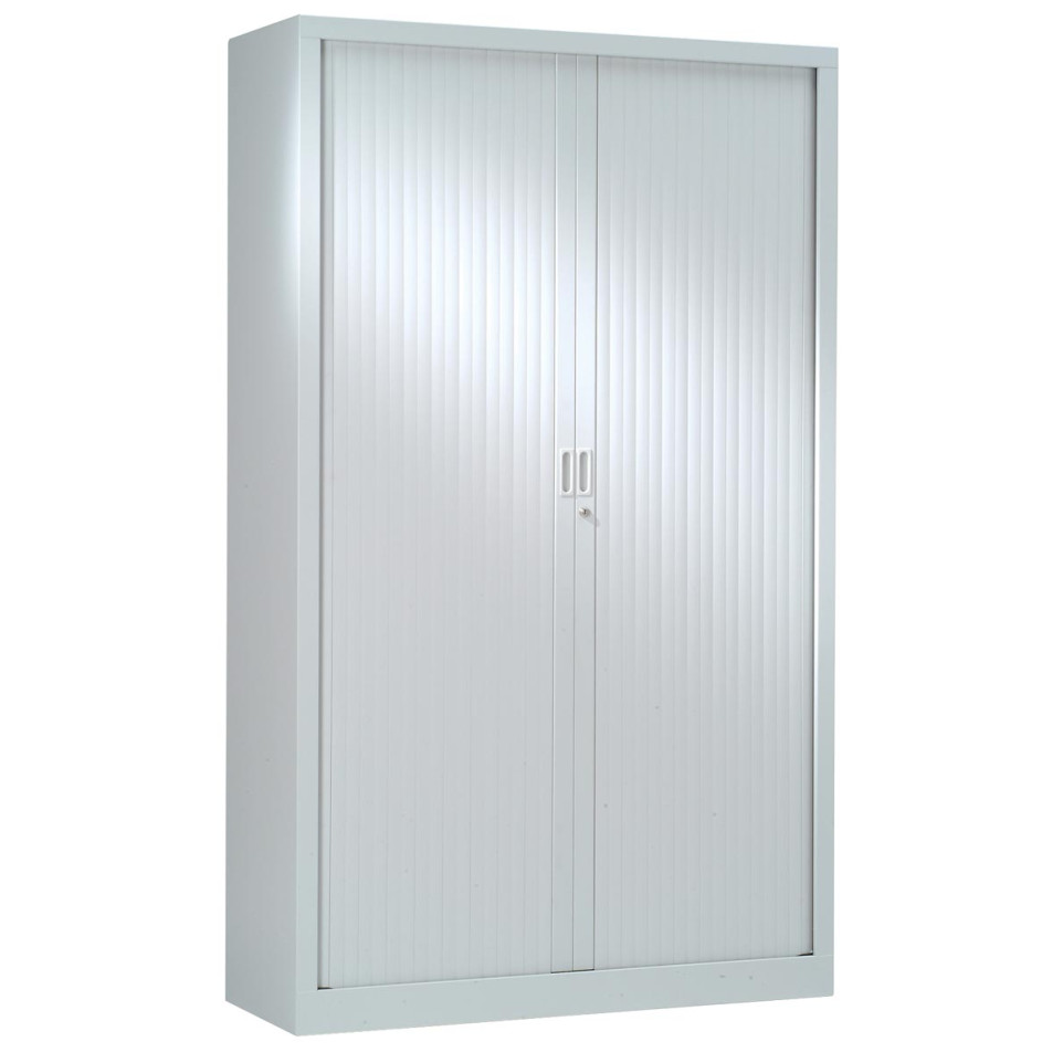 This tall curtain cabinet is designed for secure and organized storage of suspended files, binders, and office supplies in professional environments such as offices, archives, or meeting rooms. Its compact sliding doors facilitate space-saving access.