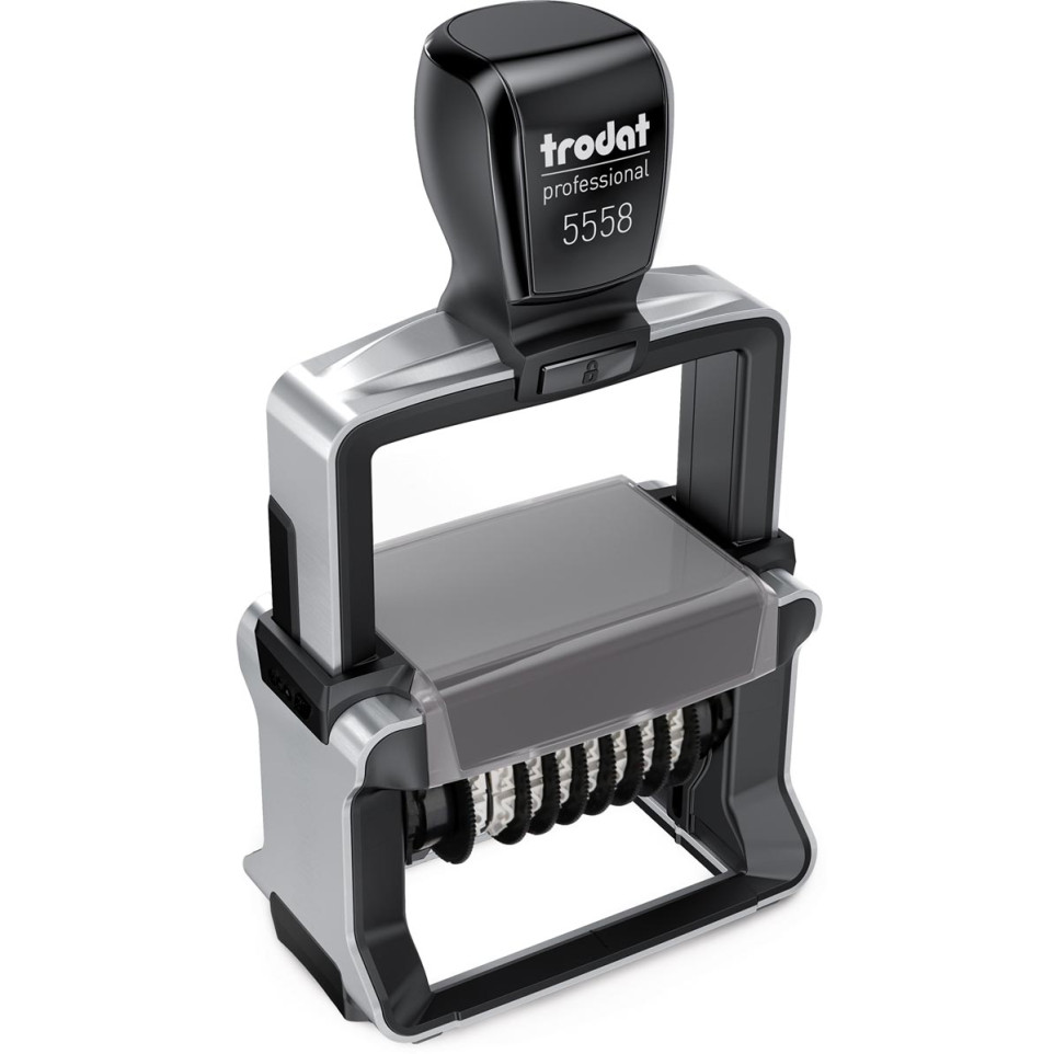 To use the Trodat Professional 4.0 numberer 5558, simply turn the wheels to rotate the band to the desired position, and then stamp your documents. The self-inking mechanism ensures that each impression is precise and consistent.