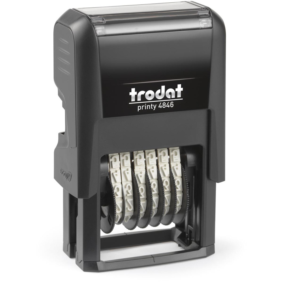 The Trodat Printy 4846 is a compact, self-inking numberer designed for efficient document marking in offices, administrative settings, or inventory management. It produces clear, consistent 6-digit impressions with 4 mm character height.