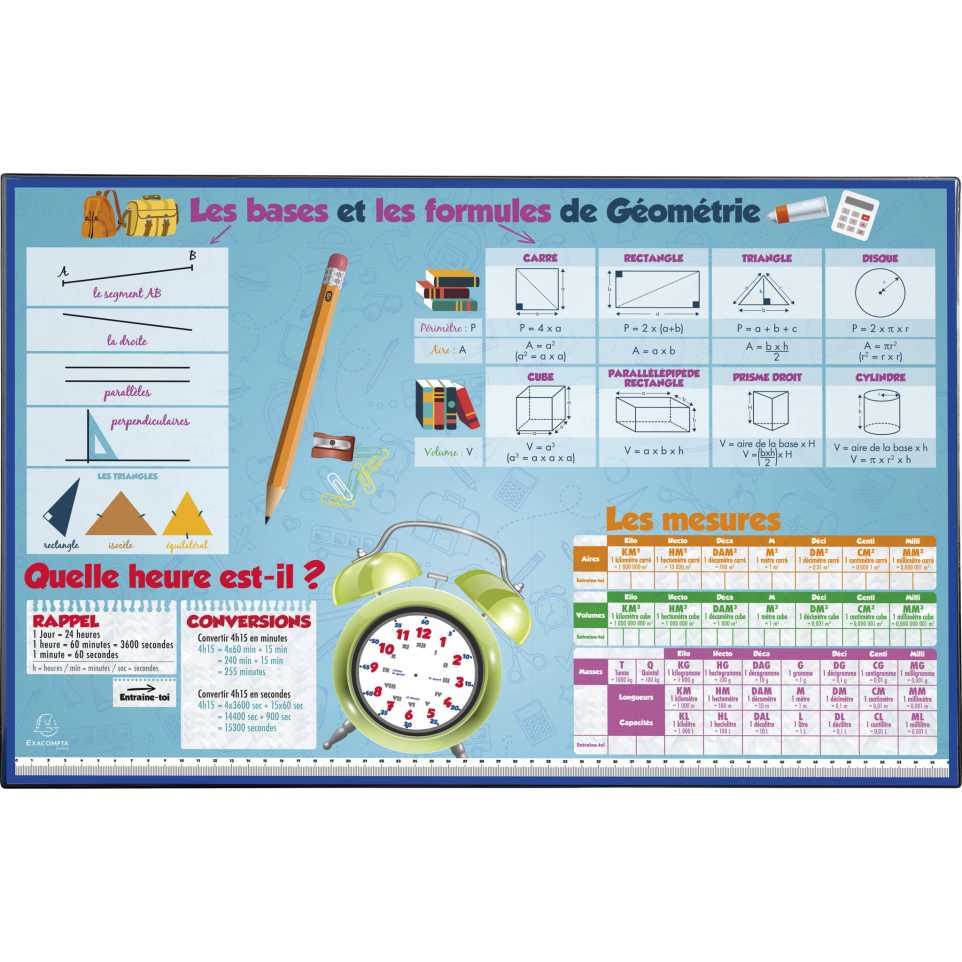 Sous-main rigide PVC Maths - 37,5x57,5 cm Le sous-main Exacompta est rigide et parfaitement adapté pour protéger votre bureau tout en apportant un vrai confort pour l'écriture ou l'utilisation d'équipements informatiques tels que la souris, le clavier.... En carton recouvert de PVC, il résiste aux taches d'encre, à l'eau, et se nettoie très facilement. Educatif, il affiche les notions d'apprentissage de l'heure, les règles de mesures, les bases et formules de géométrie qui permettront aux jeunes comme aux moins jeunes d'apprendre ou se remémorer les notions élémentaires de mathématiques. Durable et design, il résiste à un usage quotidien et intensif tout en décorant agréablement l'espace bureau de l'enfant ou l'adolescent. Fabriqué en France dans une de nos usines Exacompta, normes Européennes, PVC sans phtalate.