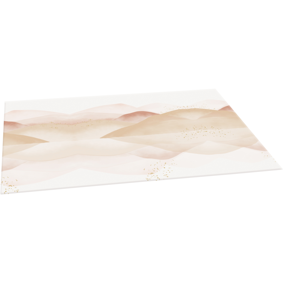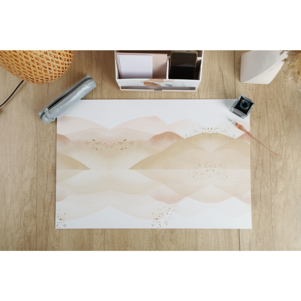 Evanescence, Sous main 60x40cm. Edith Duprez-Chenu est créatrice de motifs et illustratrice chez Edith and Co Design. Passionnée par les couleurs, les matières, les motifs dans tout ce qui l'entoure, Edith Duprez s'efforce de capturer la beauté de la vie à travers des coups de pinceau fluides et intuitifs. Pour cela, elle affectionne particulièrement l'aquarelle, ce medium qui a sa propre expression, sa délicatesse et qui révèle des couleurs imprévisibles ! Dans cette nouvelle collection, Edith mêle formes géométriques et abstraites, line art et paysages aquarellés dans des nuances de rose, beige, ocre et bleu. Ces teintes poudrées sont sublimées par des touches dorées pour un rendu plein de douceur. 1 visuel paysage rose. Fabriqué à base de carton certifié PEFC, pelliculage satiné, sérigraphie or.