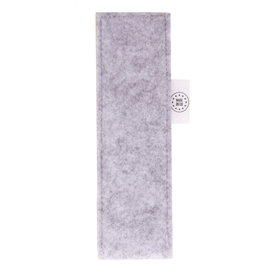 Custom-made pen case in white and grey, crafted from RPET felt, designed to securely hold pens at any desk or workspace. Features a full colour printed front and a press-stud closure for everyday convenience.