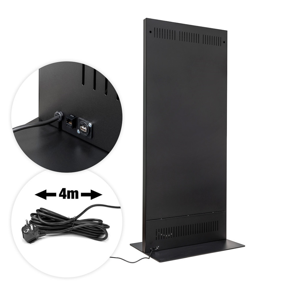 - What maintenance does the digital totem require? Regular cleaning of the screen surface with a soft, dry microfiber cloth is recommended. Ensure adequate ventilation around the unit and periodically inspect cable connections and the locking mechanism to maintain optimal performance.