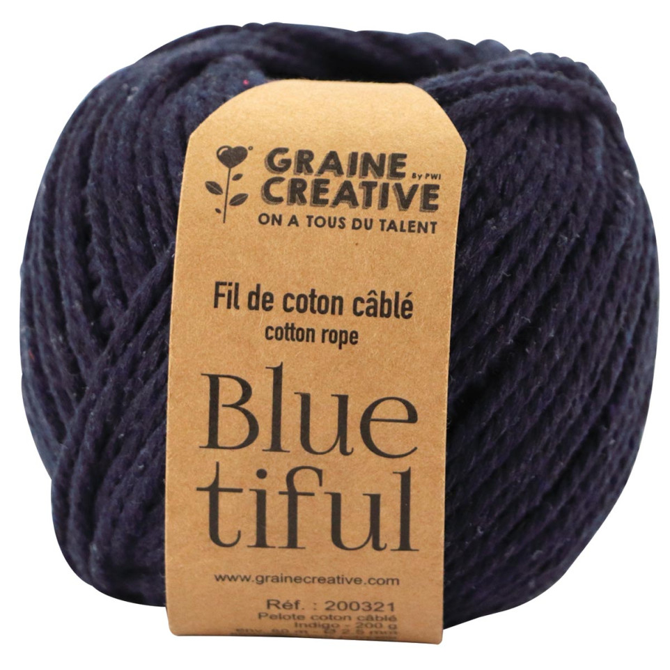 Macramé cord by Graine Créative, 2.5 mm thick and 80 m long, made from cotton in an indigo shade. Designed for creative DIY crafts, it is suitable for macramé projects such as wall hangings, plant holders, and decorative pieces.