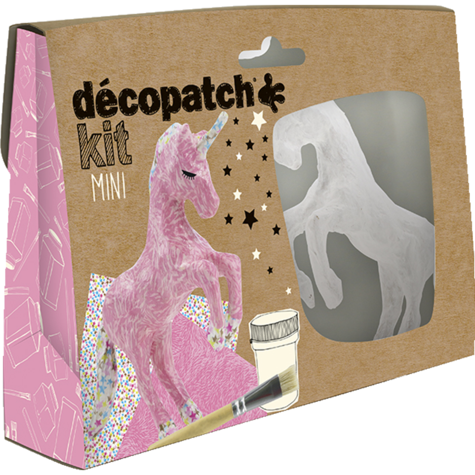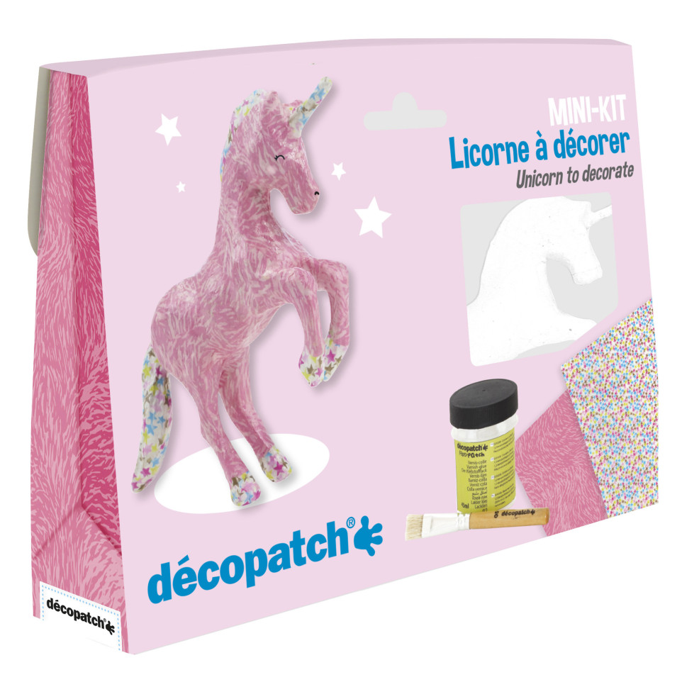 Unicorn Mini-Kit COMPLETE DÉCOPATCH KIT: A Mini-kit containing all the materials to have fun with Décopatch! An adorable little animal to decorate that will melt your heart,1 brush, 1 pot of glue and 2 sheets of Décopatch paper to personalise your animal. CHILDREN'S ACTIVITY: The Décopatch Mini-Kit is the essential tool for introducing children to the Décopatch technique while having fun. At the end of the creation, the little unicorn becomes a decorative object or your child's favourite toy! For a birthday, for christmas, it's a wonderful gift idea for children aged 5 and up, whether they're girls or boys. USE: To create the mini-kit, tear or cut some pieces of Décopatch paper, approximately 2x2 cm in size. Then apply the glue to the surface. Finally, place a piece of paper on the glued area and add a second layer of glue on top. UNICORN TO DECORATE: With the 2 sheets provided inside, decorate and personalize your unicorn to make it unique. DIMENSIONS: Figurine: 14x4x12 cm - 2 Sheets of 30x40 cm. Compliant with CE standards, made in France.