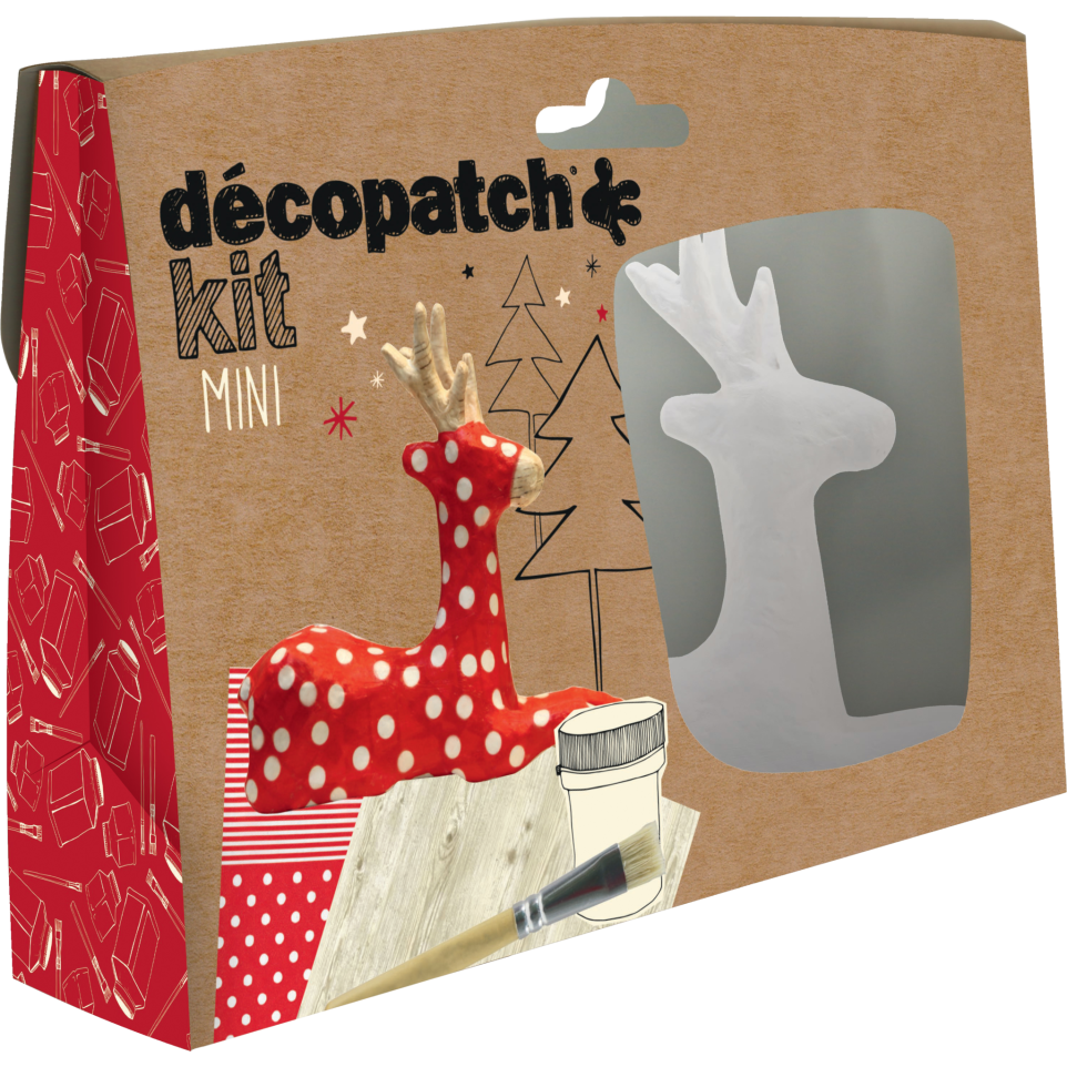 Mini-kit renne Contient tout le matériel pour décorer un petit renne Décopatch : un renne en papier mâché blanc (14x4x12cm) + deux feuilles de papier Décopatch (30x40cm) + un pinceau (9x1cm) +un pot de vernis-colle (4x4x5 ,5cm) Technique facile : déchirer des petits morceaux de papier (2x2cm environ) puis appliquer du vernis-colle sur une partie de l'animal. Poser un morceau de papier sur cette même surface et appliquer une nouvelle couche de vernis-colle par-dessus. Répêter l'opération en superposant les morceaux de papier jusqu'à ce que l'animal soit totalement ou partiellement recouvert. Une fois décoré, l'enfant pourra jouer avec le petit animal qu'il a lui-même créé. Il sera fier du résultat obtenu. A offrir pour un anniversaire ou pour découvrir l'activité, ce kit d'initiation à la technique Décopatch est très simple à réaliser. Conforme aux normes CE. Convient à tous les enfants de 5 ans ou +. Made in France.