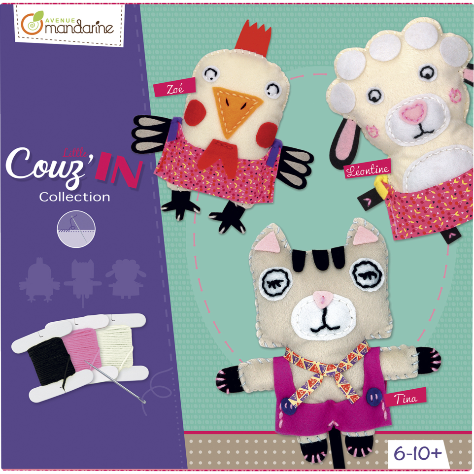 * Big creative box, Little Couz'IN COUZ'IN COLLECTION: The Couz'In collection is the all-in-one sewing initiation kit for children who will make their own comforter! Designed in pre-punched felt, this iconic Avenue Mandarine product is the perfect tool for girls and boys to discover haberdashery. EASY: The box is composed of 3 Couz'In figurines which represent adorable little animals with all the necessary materials. Thanks to a plastic needle, no risk for your child. CONTENTS: 3 pre-punched felt animals, 3 adhesive felt pieces, 3 stuffing wadding, 3 plastic needles, 4 spools of thread (x3), 3 ribbons and 3 instructions. Aesthetic box that can be reused as storage. DIMENSIONS: 27 x 27 x 6.8cm COMPLIANCE: Complies with CE standards to ensure the safety of your children.