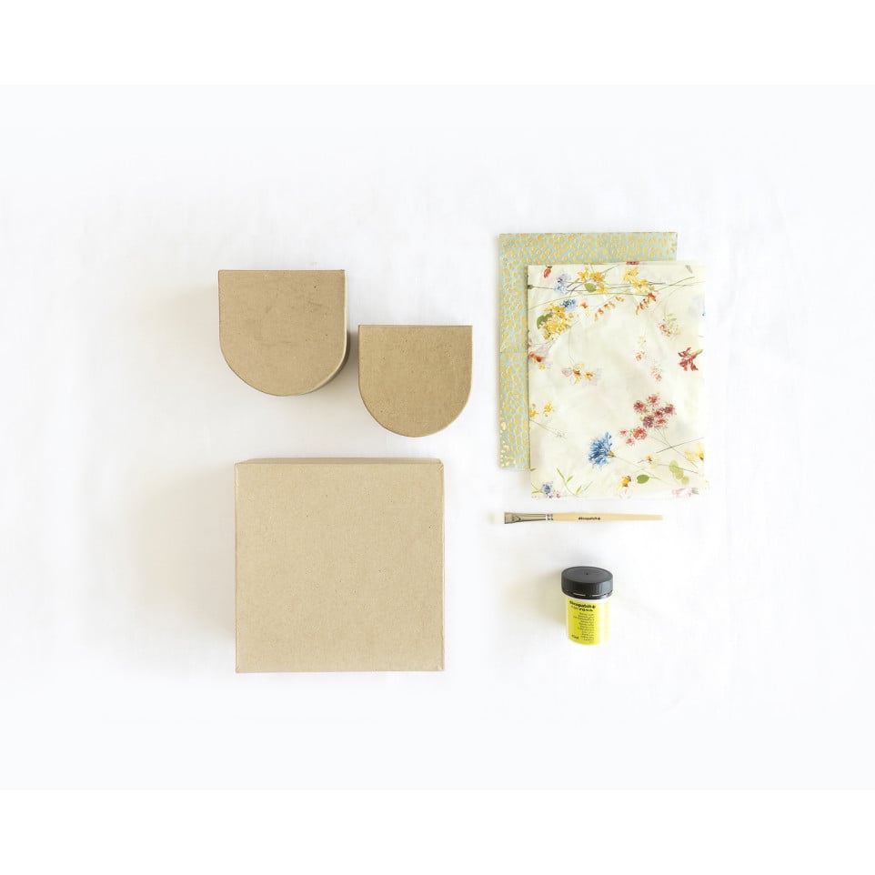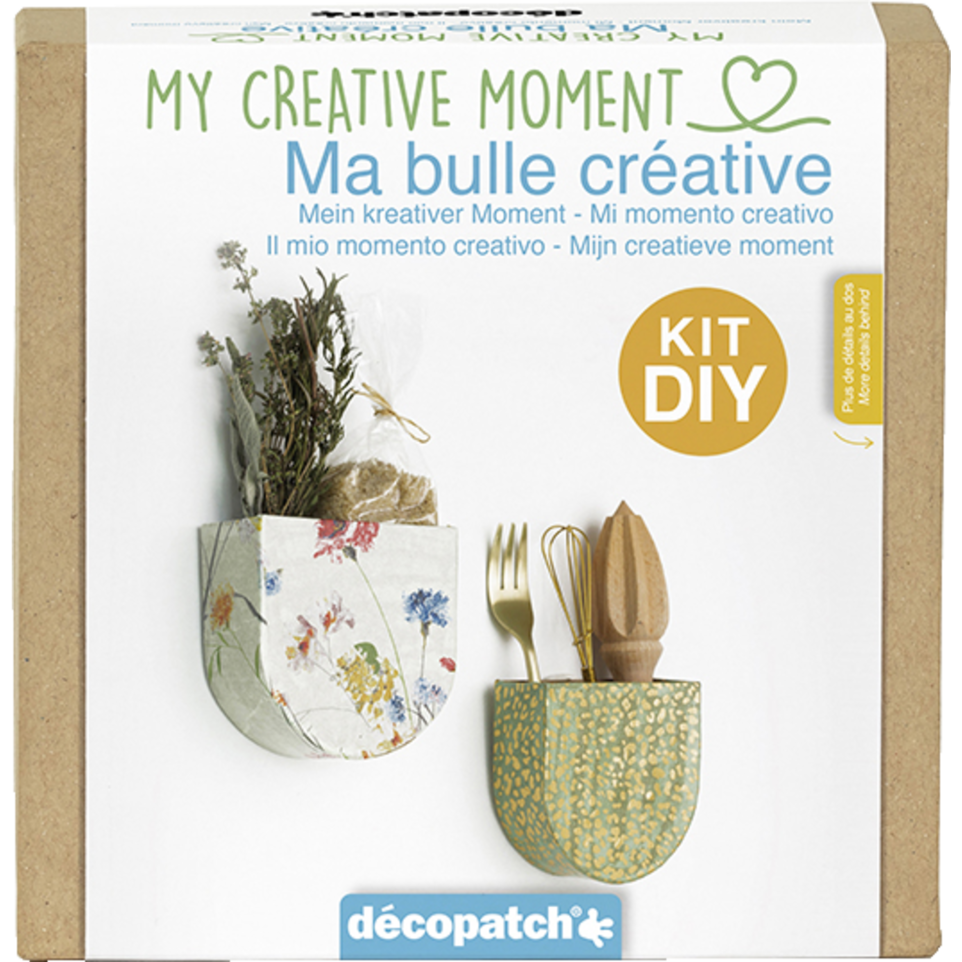 My Creative Moment - Kit Wall Vase MY CREATIVE MOMENT KIT: A Kit for anyone who wants to unwind and take time for themselves. A complete kit for (re)discovering the Décopatch technique through the creation of trendy decorative objects. REUTILISABLE: The mini-kit's box is made of paper-mâché, so it can also be customised and used as a storage box. USE: To create the mini-kit, tear or cut some pieces of Décopatch paper, approximately 2x2 cm in size. Then apply the glue to the surface. Finally, place a piece of paper on the glued area and add a second layer of glue on top. CONTENT: 2 hanging baskets made of papier-mâché 10x4x10/9x3.5x9cm, 2 Décopatch paper sheets 30x40cm, 1 brush 1.5x16.5cm, and 1 pot of glue 45ml. MADE IN FRANCE: Décopatch is a French brand owned by the Clairefontaine Rhodia Group. Located in the suburbs of Lyon, a team of enthusiasts constantly seeks new ideas to meet the trends in customization, decoration, and creative hobbies.
