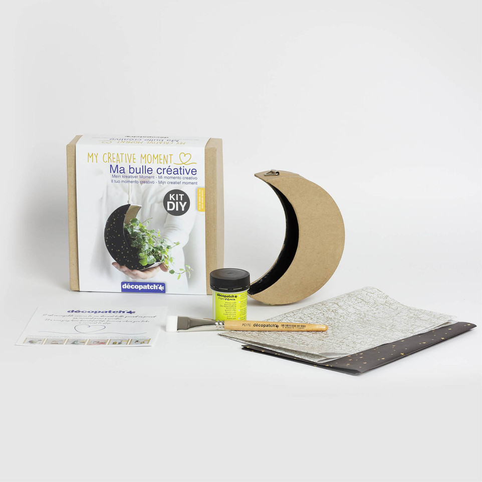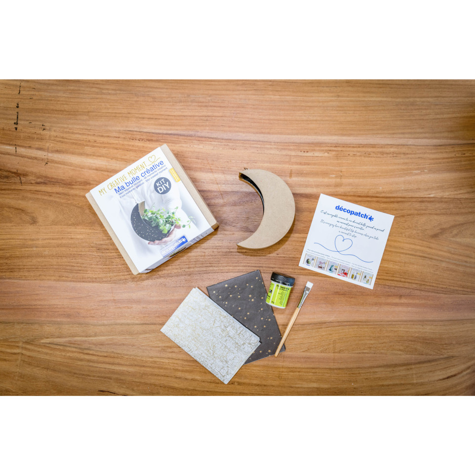 My Creative Moment - Kit Moon MY CREATIVE MOMENT KIT: A Kit for anyone who wants to unwind and take time for themselves. A complete kit for (re)discovering the Décopatch technique through the creation of trendy decorative objects. REUTILISABLE: The mini-kit's box is made of paper-mâché, so it can also be customised and used as a storage box. USE: To create the mini-kit, tear or cut some pieces of Décopatch paper, approximately 2x2 cm in size. Then apply the glue to the surface. Finally, place a piece of paper on the glued area and add a second layer of glue on top. CONTENT: 1 waterproof papier-mâché moon pot 10x4x14cm, 2 Décopatch paper sheets 30x40cm, 1 brush 1.5x16.5cm, and 1 pot of glue 45ml. MADE IN FRANCE: Décopatch is a French brand owned by the Clairefontaine Rhodia Group. Located in the suburbs of Lyon, a team of enthusiasts constantly seeks new ideas to meet the trends in customization, decoration, and creative hobbies.
