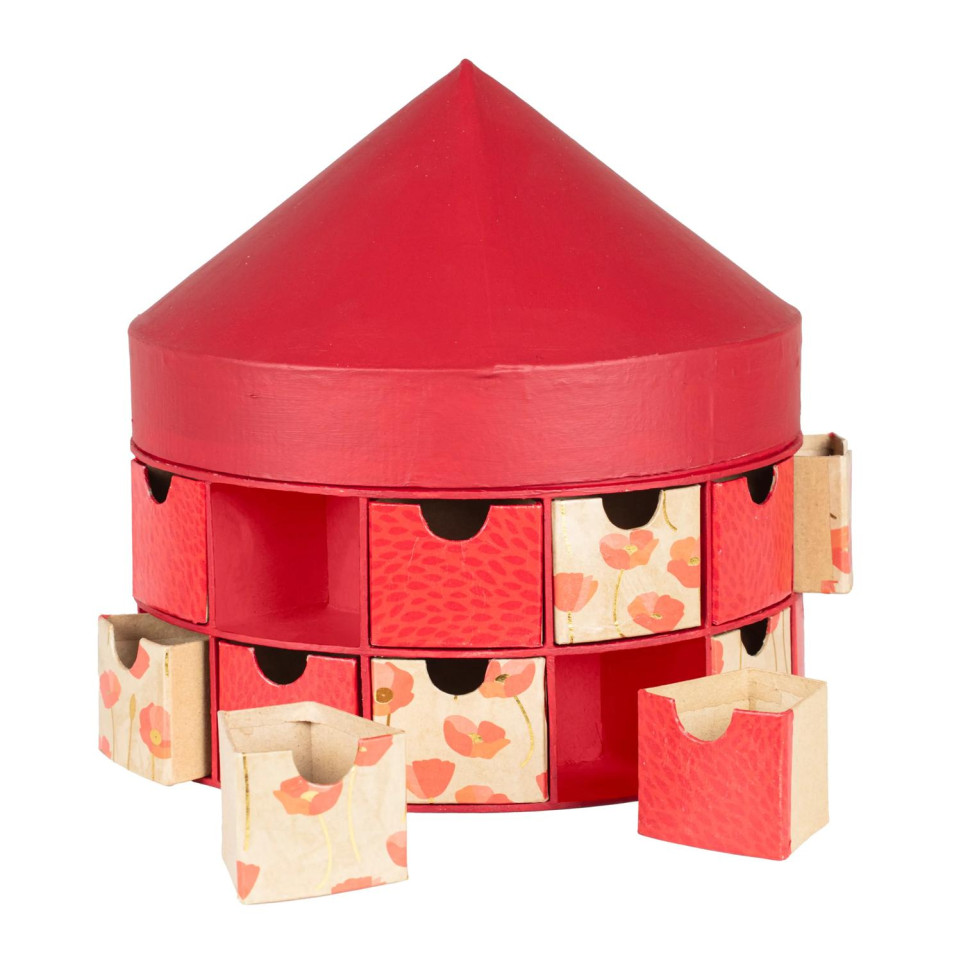 Calendrier de l'avent Carroussel À CUSTOMISER : En papier maché brun, mixer les techniques : peinture, collage, feutres, paillettes - idéal pour un moment de partage en famille. À ASSOCIER AUX PAPIERS DECOPATCH : déchirez ou découpez quelques morceaux de papier Décopatch d'environ 2x2 cm - Appliquez la colle sur le support. Déposez un morceau de papier sur la surface encollée et mettre une deuxième couche de colle dessus. FABRIQUÉ A LA MAIN : composé de papier journal et de colle de riz, chaque support est unique. 24 TIROIRS : parfait pour renfermer papillottes et autres petits trésors. Ce carroussel peut également servir de rangement pour des petits accessoires (bouton, fils, vis, figurines.). Dimensions d'une case 5x5x3,2cm CALENDRIER DE L'AVENT : cachez friandises et chocolats pour aider votre enfant à patienter jusqu'à Noël. Très joli en déco, au centre d'une table. Réutilisable à l'infini.