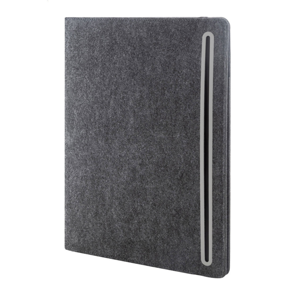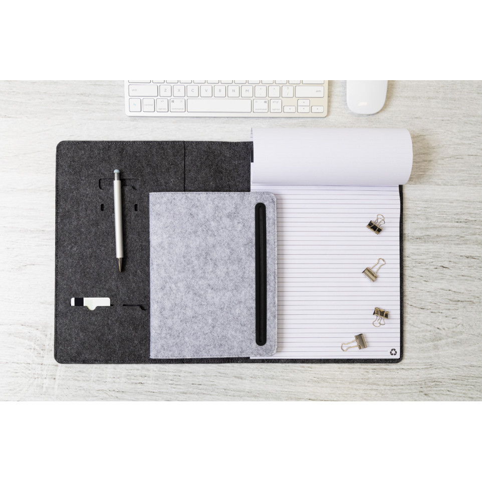 Eco-friendly document organizer crafted from recycled PET felt in elegant dark grey. Features multiple pockets and includes a 20-sheet lined notepad made from recycled paper, perfect for sustainable business organization.