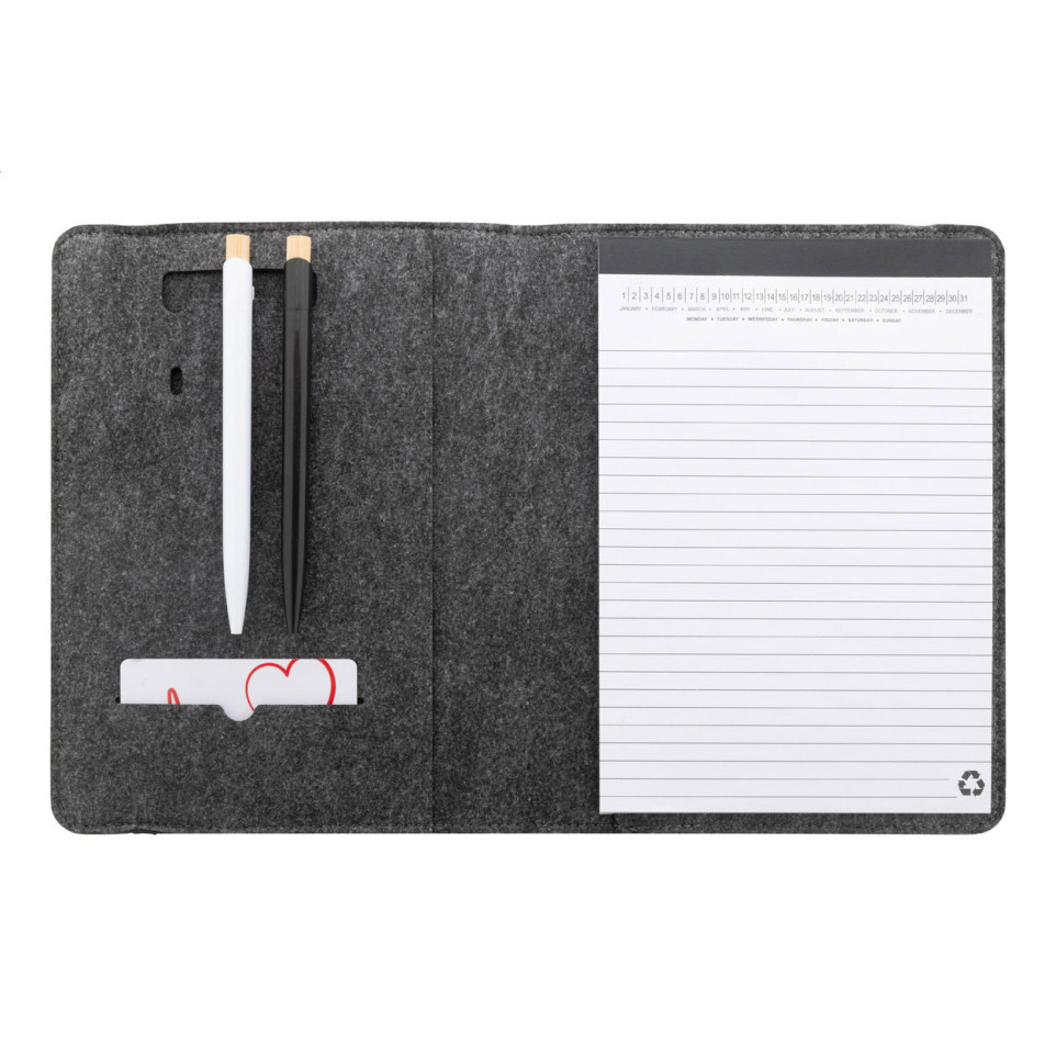 Is this folder truly eco-friendly? Yes, it's made from RPET (recycled polyethylene terephthalate) felt derived from post-consumer plastic bottles, and includes a notepad of recycled paper, minimizing environmental impact.