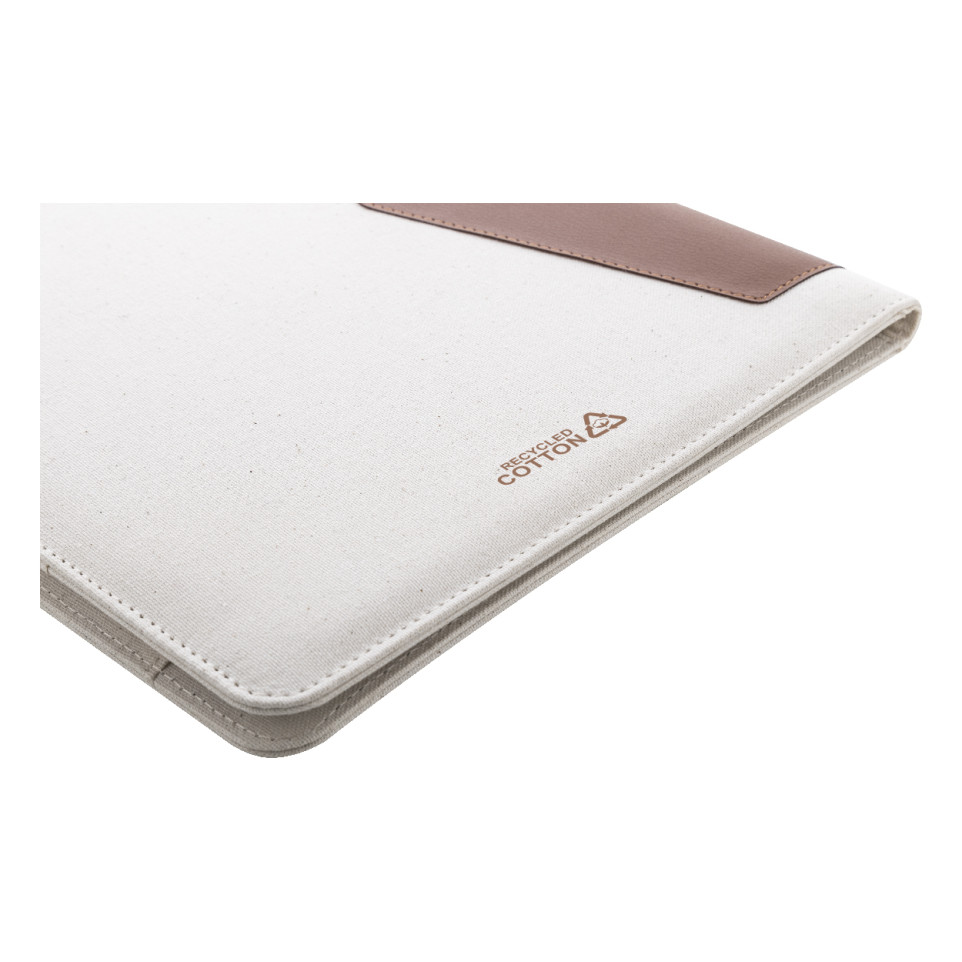 The folder is made from 70% recycled cotton, 30% RPET polyester canvas, and recycled PU leather.