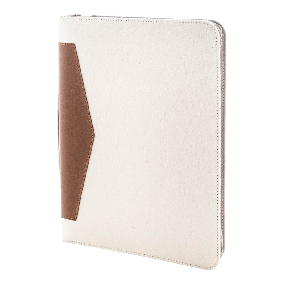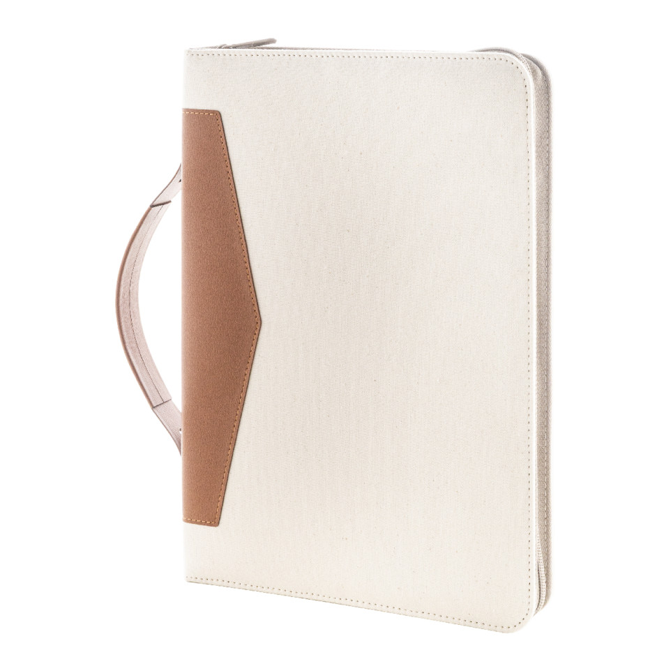 A4-sized zipped document folder made from 70% recycled cotton and 30% RPET polyester with recycled PU leather elements. Features a sturdy carry handle, multiple inside organizer pockets, and a 20-sheet lined notepad in recycled paper. Ideal for meetings, presentations, or daily business use.