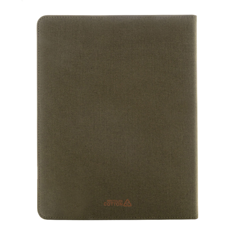 A4-sized document folder made of recycled canvas and recycled PU leather, featuring multiple front and internal organizer pockets and a 20-sheet lined notepad in recycled paper. Ideal for professional or academic organization.