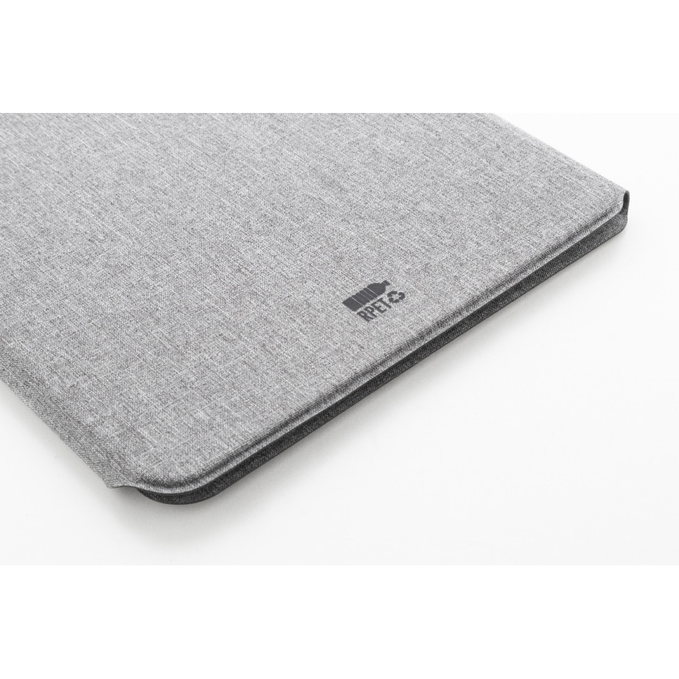 A4-sized document folder crafted from grey RPET polyester, equipped with multiple internal organizer pockets and a magnetic closure finished with a walnut wood accent. Includes a notepad of 20 lined sheets made from recycled paper, ideal for meetings, conferences, or daily office use.