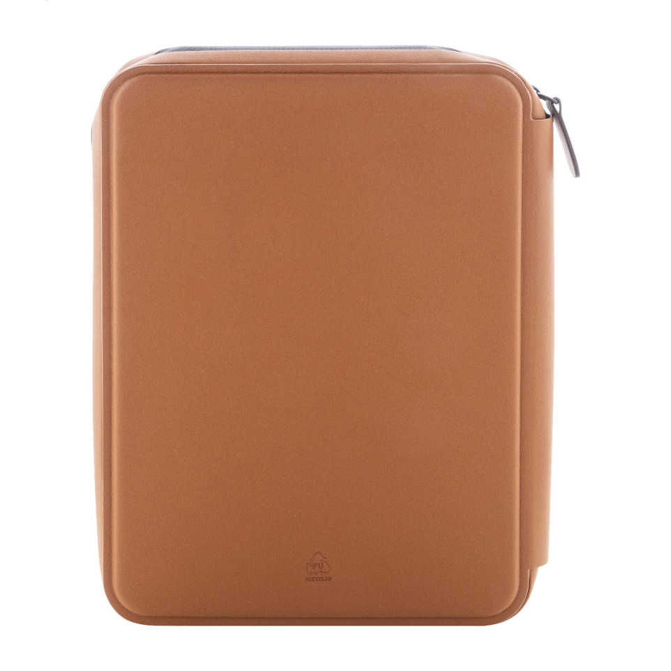 The Pulux Note brown RPU document folder is a zipped luxury organizer in A5 format, crafted from recycled PU leather, and supplied with a 64-sheet lined notepad made from recycled paper. It offers practical document storage and notetaking for business settings.