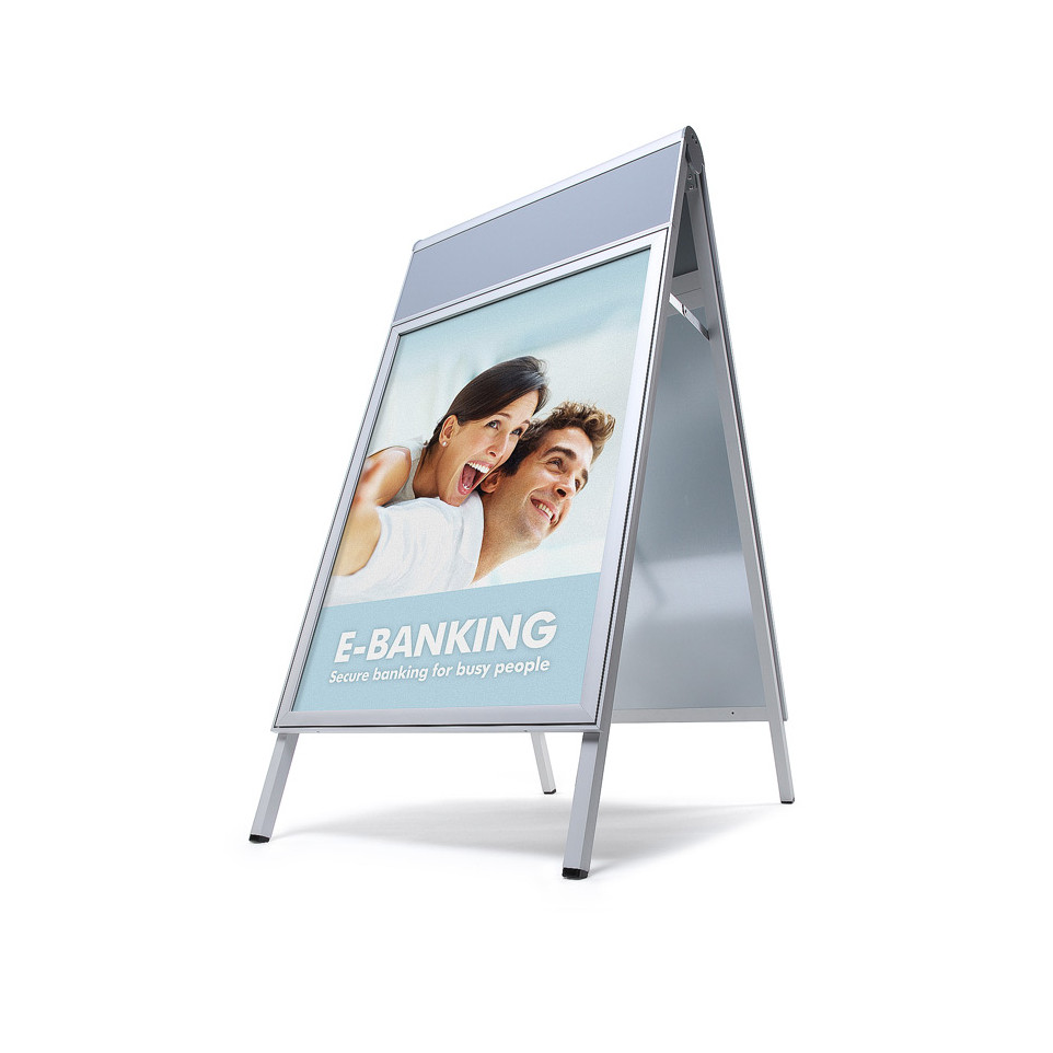 Place your printed posters inside the secure snap frames on both sides for quick message updates. The top area accommodates a custom logo panel, ensuring your branding is always prominent. Ideal for shops, restaurants, and public venues requiring weather-resistant sidewalk advertising.