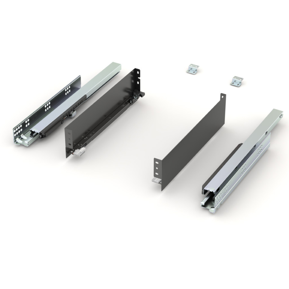 - Kit Contents: Left and right slides, left and right ultra-slim drawer sides, 2 covers, 2 screw-on front fixing clips, 2 rear wall stabilizers, and all mounting hardware