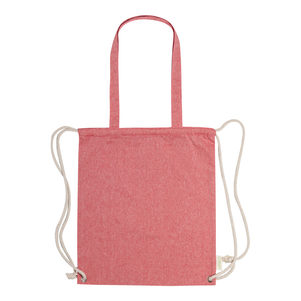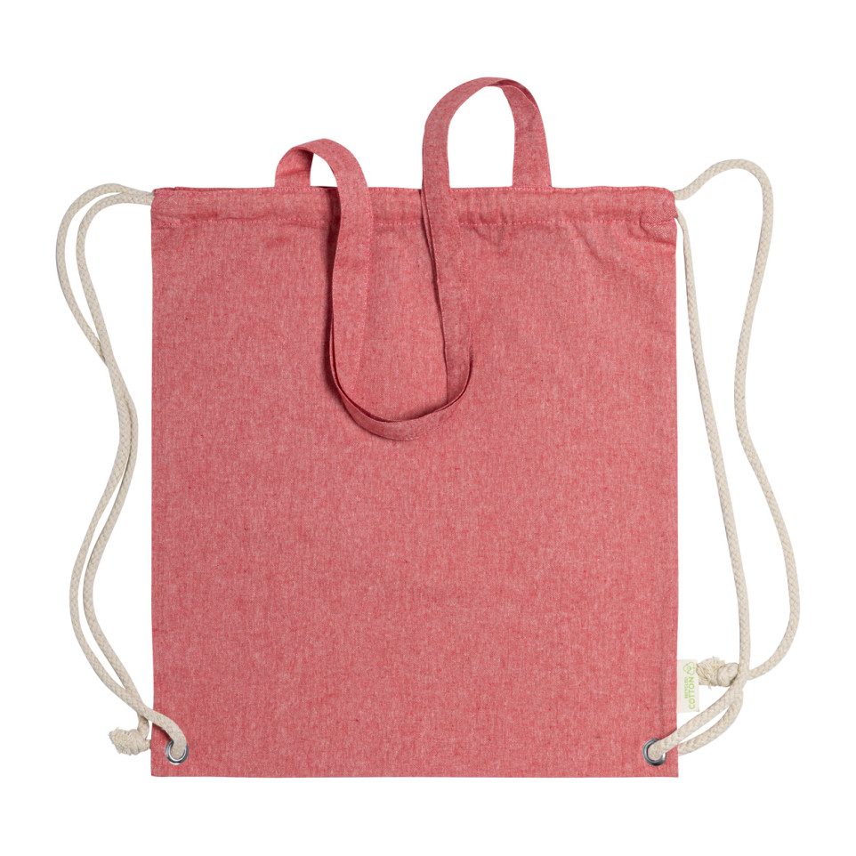 Versatile red drawstring bag crafted from recycled cotton with thick braided cords and extended handles. Perfect for shopping, carrying essentials, or as an eco-friendly promotional item.