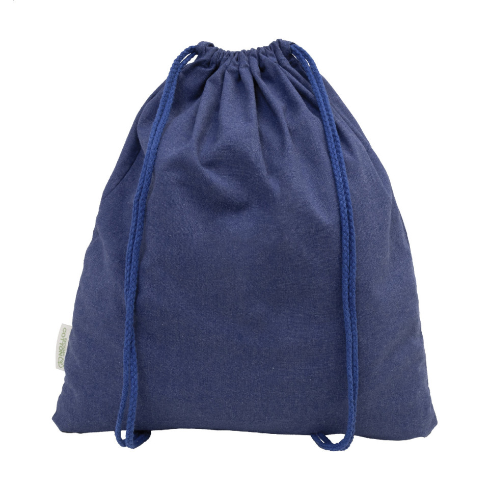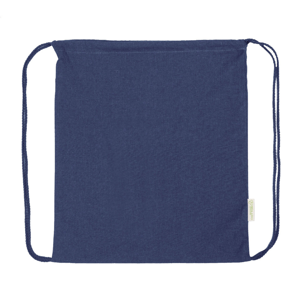 Eco-friendly blue drawstring bag made from 70% recycled cotton and 30% RPET polyester, with a sturdy 140 g/m² fabric weight. Ideal for everyday use, gym sessions, and promotional events.