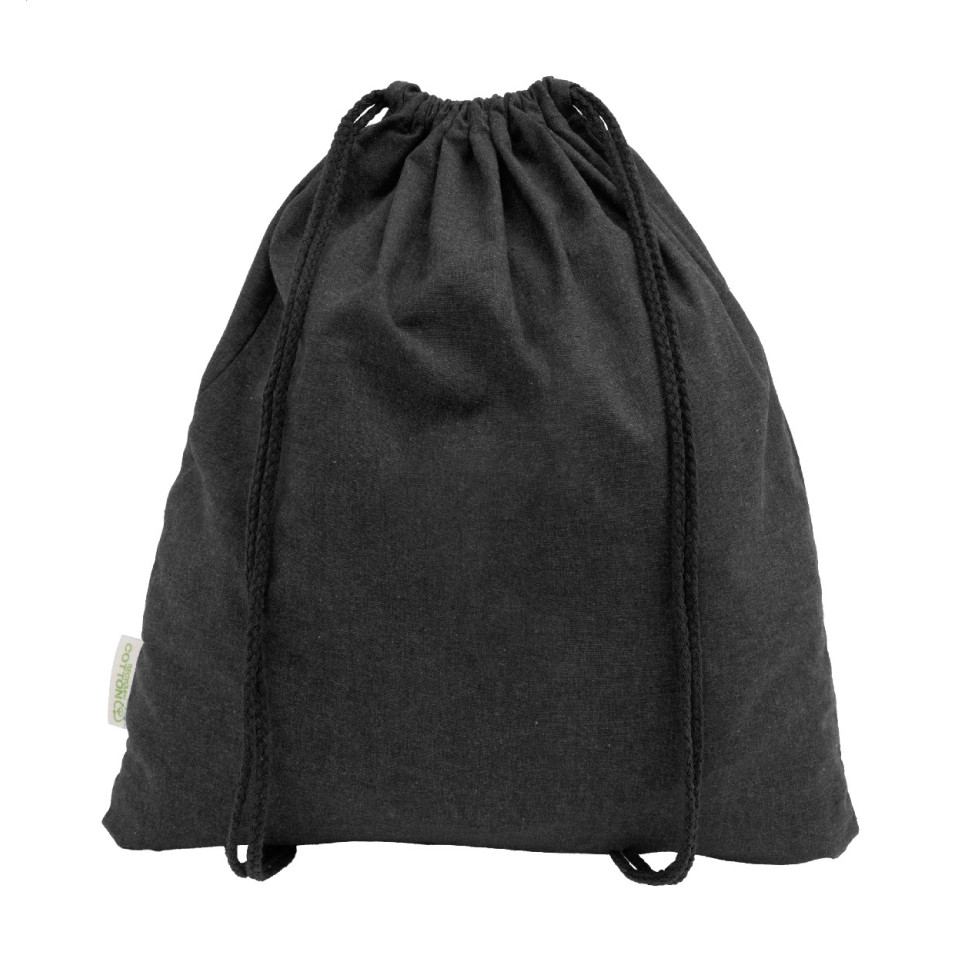 Robust drawstring bag made from 70% recycled cotton and 30% RPET polyester, 140 g/m², in black. Designed for daily use, ideal for carrying gym gear, essentials, or promotional materials.