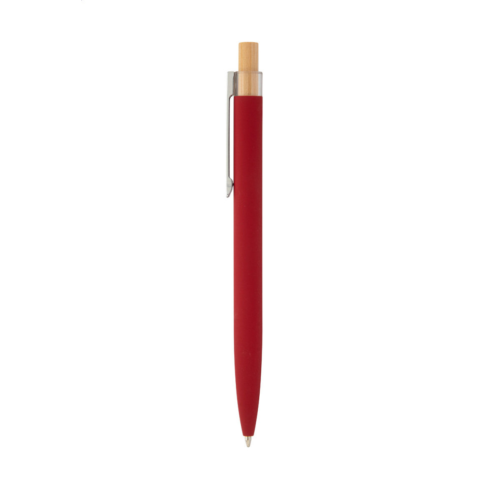 The Boshly ballpoint pen combines eco-friendly design with professional functionality. This sleek recycled aluminum pen features a rubberized finish for comfortable grip and a distinctive bamboo button, making it an elegant writing instrument for daily use.