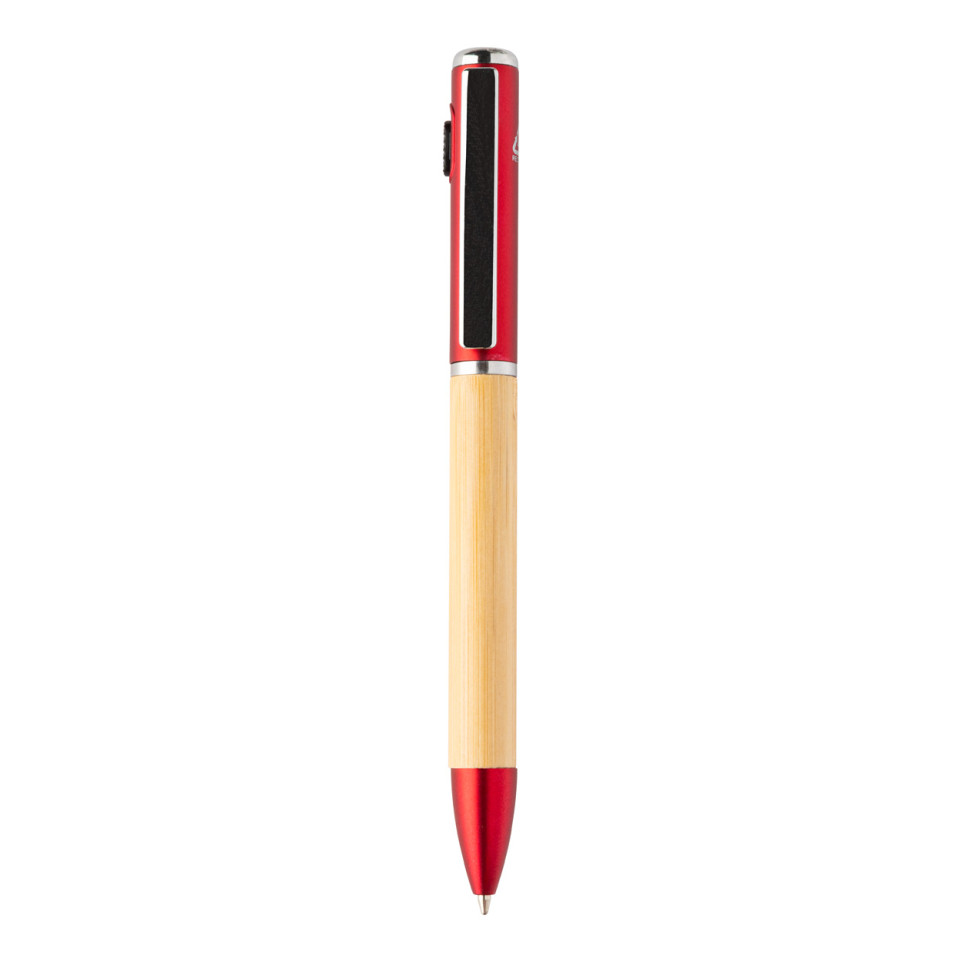 Penboo red ballpoint pen is an ecological writing instrument featuring a bamboo barrel and recycled ABS plastic components. It includes a blue ink refill and an integrated LED flashlight, suitable for everyday use at home, in the office, or on the go.