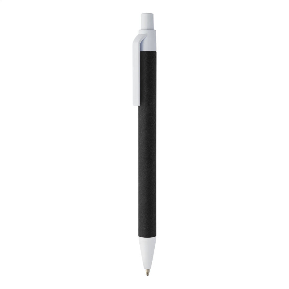 A ballpoint pen crafted from recycled paper and recycled ABS components, designed for everyday writing with a smooth blue ink refill. Ideal for eco-conscious users and sustainable office environments.