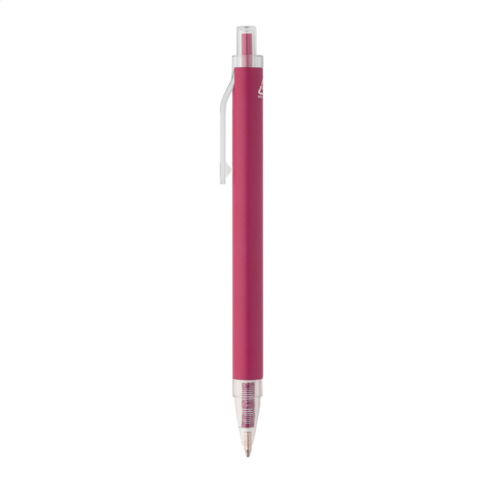 Recycled aluminum ballpoint pen in pink with matte finish body and transparent RPET parts, featuring a blue refill. Ideal for everyday writing and eco-conscious promotional use.