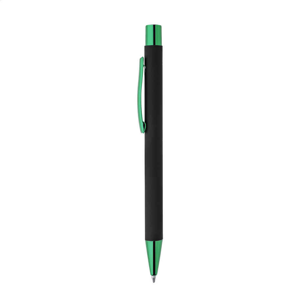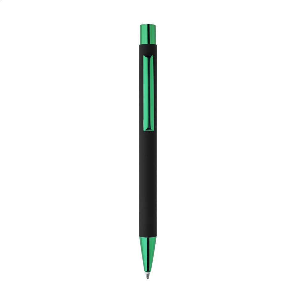 1. What material is this pen made from? — The pen is made from recycled aluminium with a black rubberized body and coloured shiny metallic finish components.