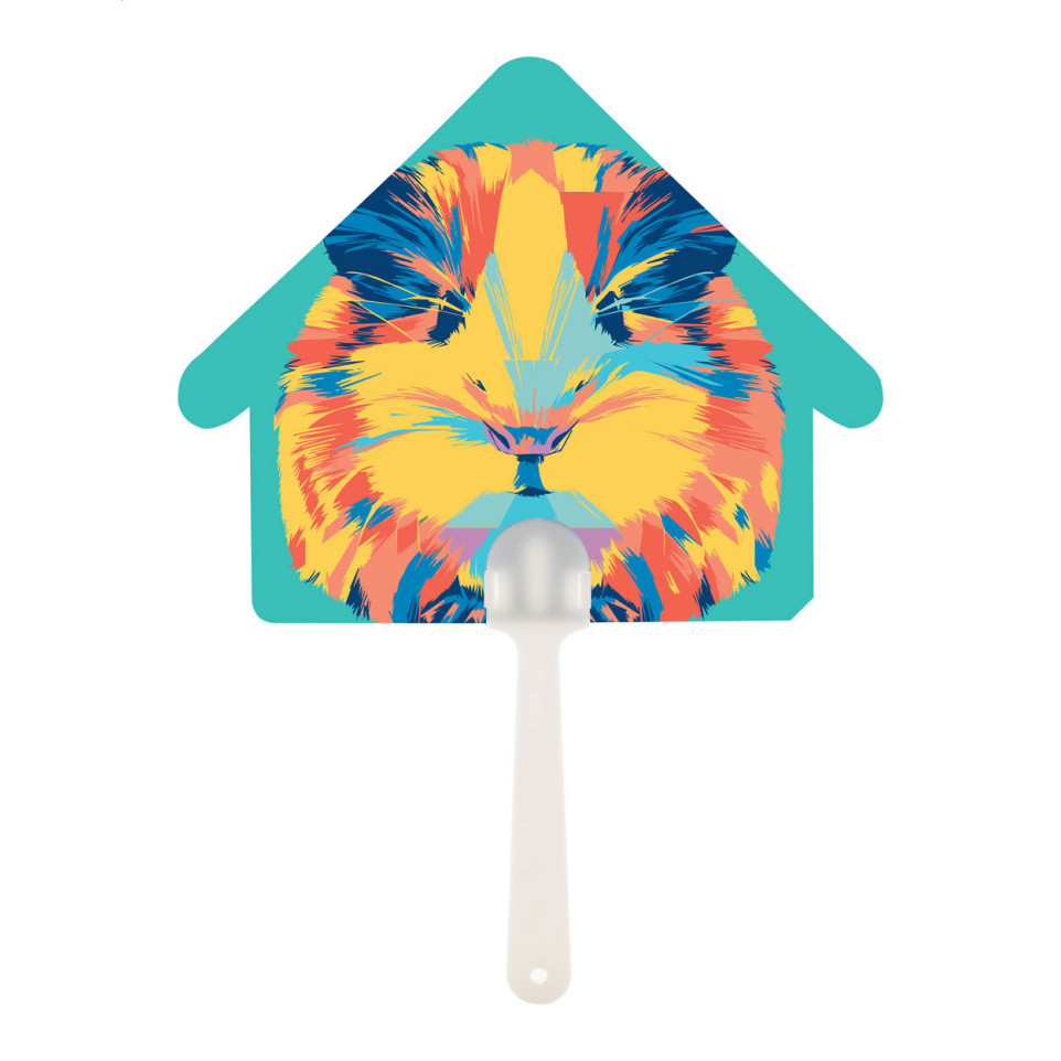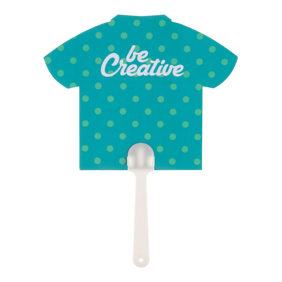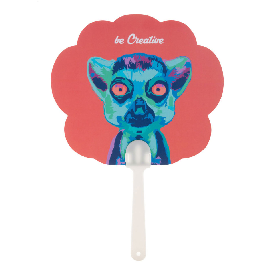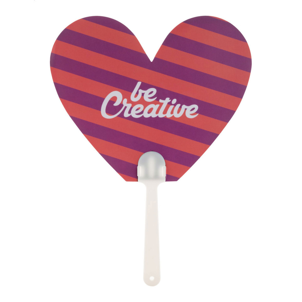 Custom made hand fan with plastic handle and laminated paper, digitally printed with your graphic on both sides. Ideal for promotional events, summer campaigns, and beating the heat while showcasing your brand.