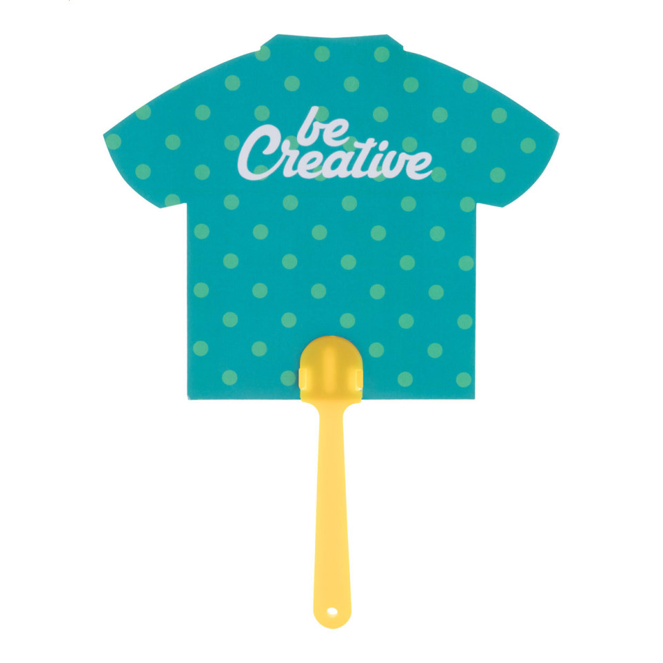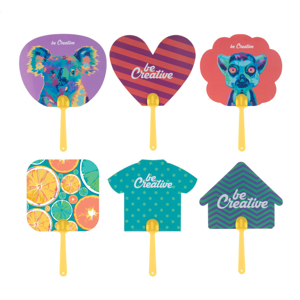 Custom made hand fan with plastic handle and laminated paper featuring digital printing on both sides. Perfect for hot summer days, promotional events, or as a branded giveaway.