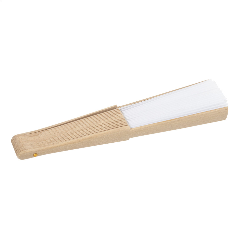 Elegant white hand fan crafted from recycled RPET polyester with wooden ribs. Perfect for outdoor events, festivals, promotional campaigns, and corporate gatherings where comfort meets sustainability.