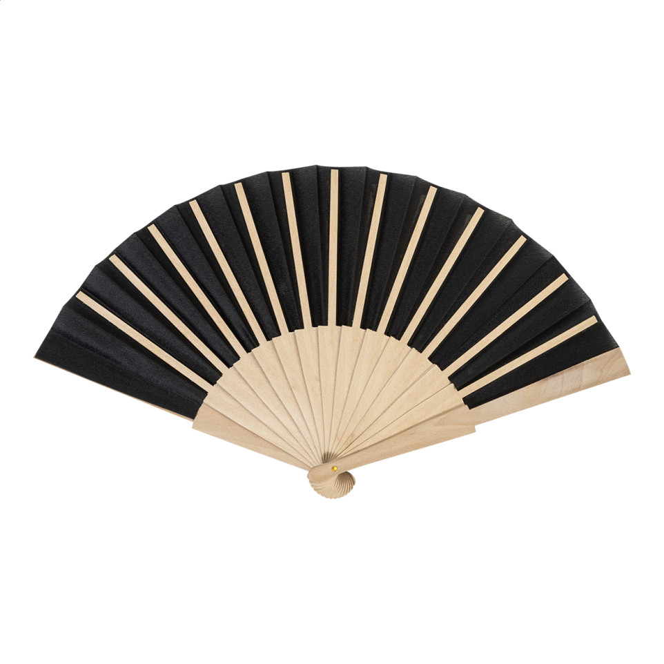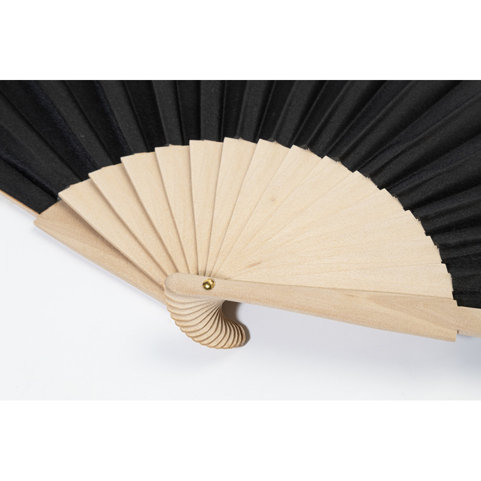 RPET polyester hand fan with wooden ribs in sleek black, ideal for personal cooling during outdoor events, summer promotions, or daily use in warm weather.