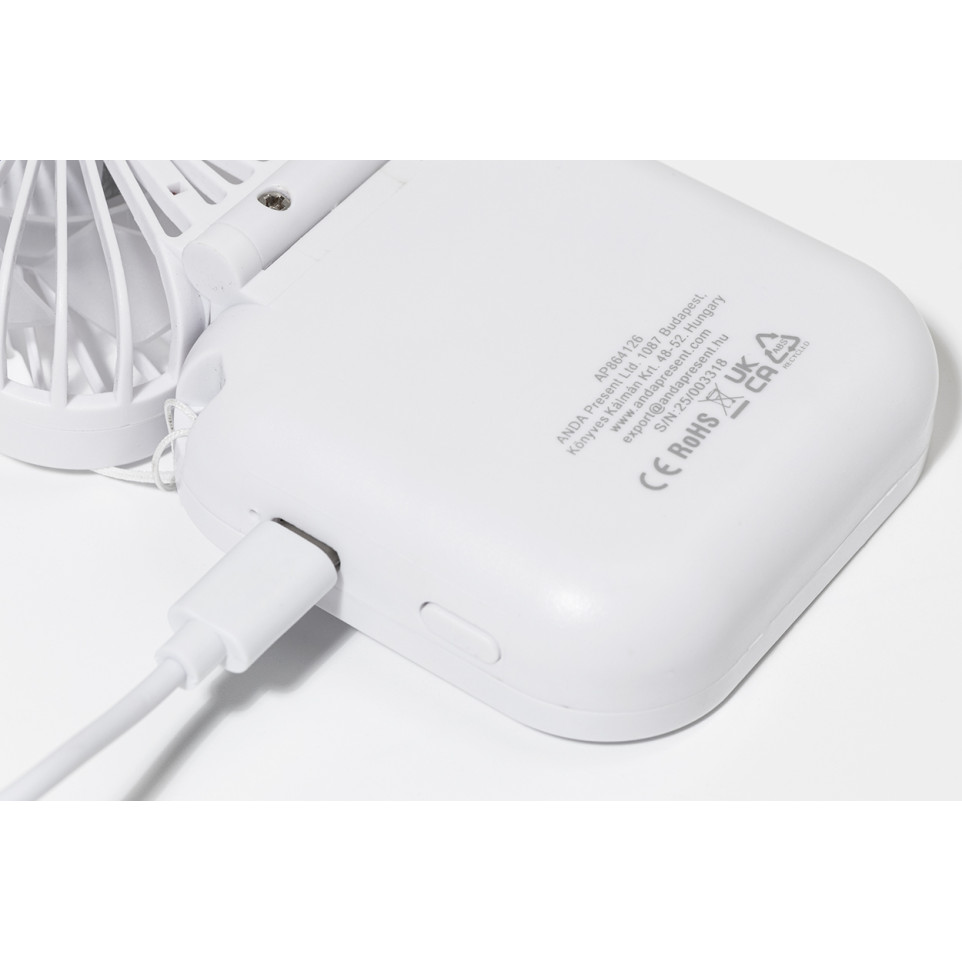 Portable Aerofold white RABS rechargeable hand fan designed for personal cooling on the go. Features adjustable head and multiple speeds for customizable airflow during travel, events, or daily use.