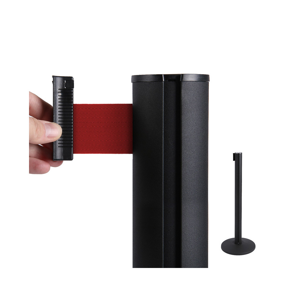 The Black Barrier Flexi Belt Post with a 2.7 m red belt is ideal for efficiently organizing and controlling pedestrian flow in public spaces such as event venues, airports, or retail stores.
