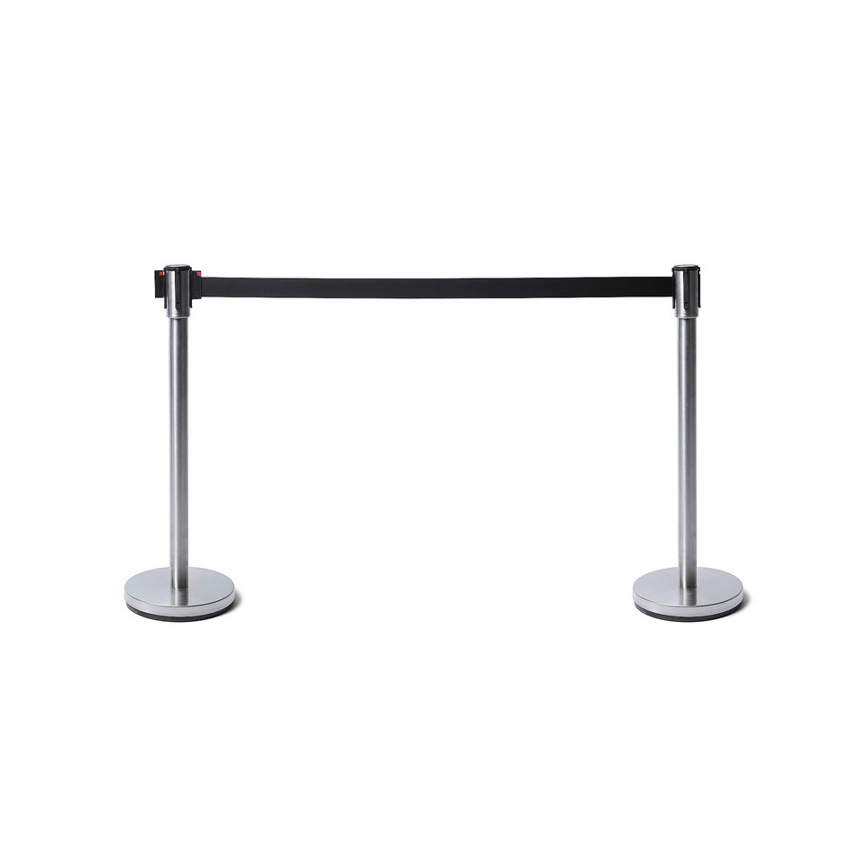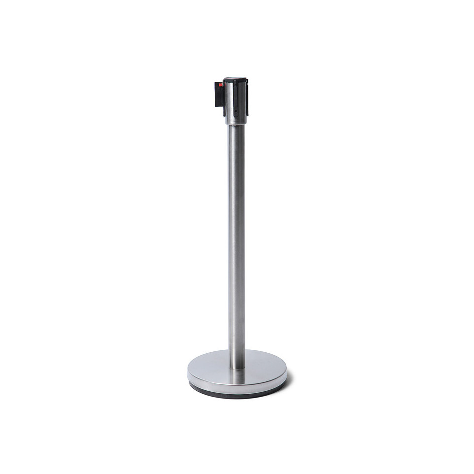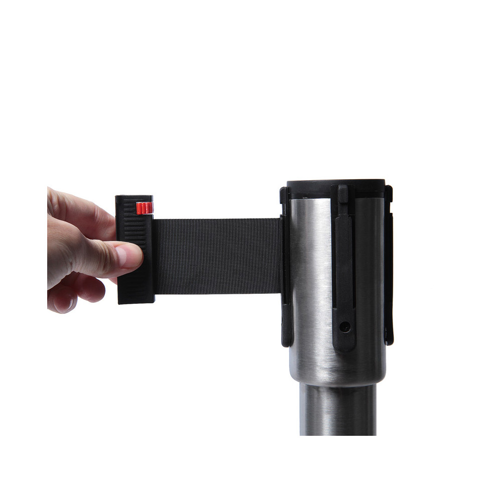 This freestanding barrier is placed securely on the floor, with its retractable belt easily extended and locked onto receiving clips of adjacent posts to manage crowds or direct traffic efficiently.