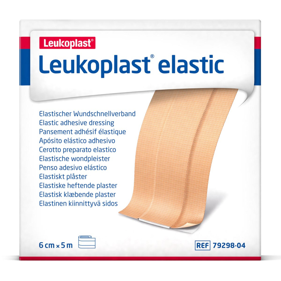 The Leukoplast pansement élastique is used for securing bandages and dressings, providing a comfortable and flexible adhesive strip for various first aid applications.