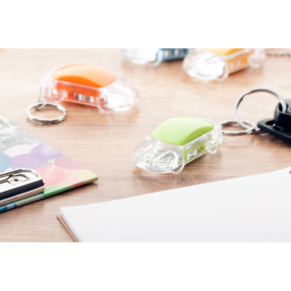 Compact car-shaped keyring made from plastic, featuring a built-in white LED flashlight and secured with a sturdy metal ring. Equipped with a button cell battery, it provides convenient lighting for keys, bags, or emergency situations.