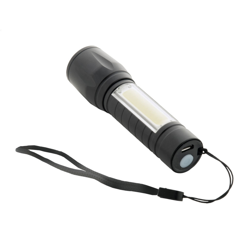 Compact rechargeable aluminium flashlight with zoomable high power COB front beam, COB side floodlight, fixed and flashing modes, carry strap, and USB charger cable. Ideal for everyday tasks, outdoor activities, or as a backup light in vehicles or bags.