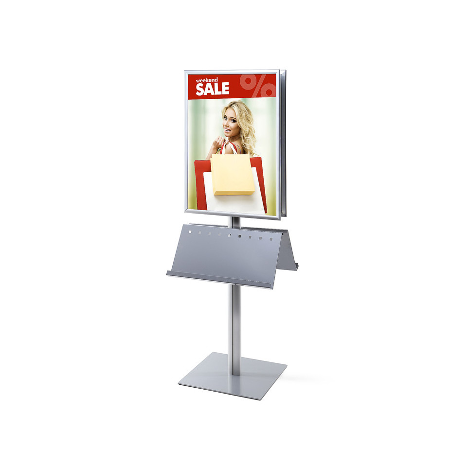 This display stand is simple to set up as a stable freestanding unit. Posters are easily inserted or replaced by snapping open the frame edges on both sides of the double-sided holder. Ideal for quick updates in fast-paced environments like retail or events